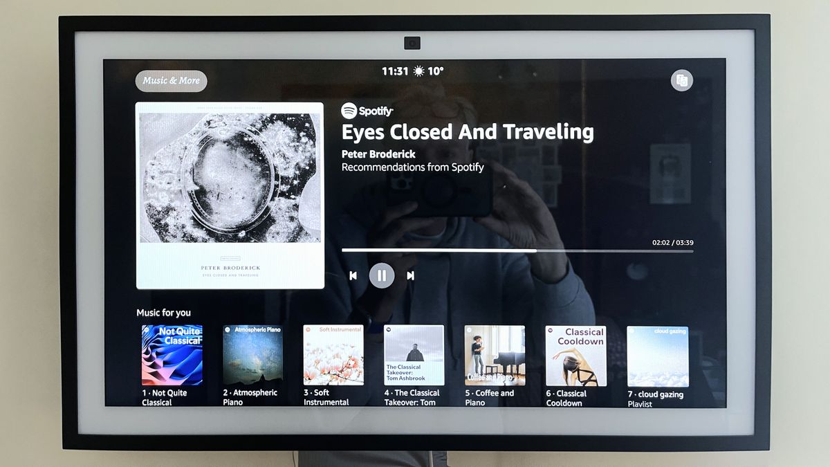 Designed to be mounted on a wall, the Echo Show 21 is aesthetically enhanced by a wooden frame, giving it a photo frame appearance. Users can customize their experience with various widgets that help manage tasks like shopping lists and calendar reminders, or check local weather. The device supports both portrait and landscape orientations, making it versatile for different spaces.