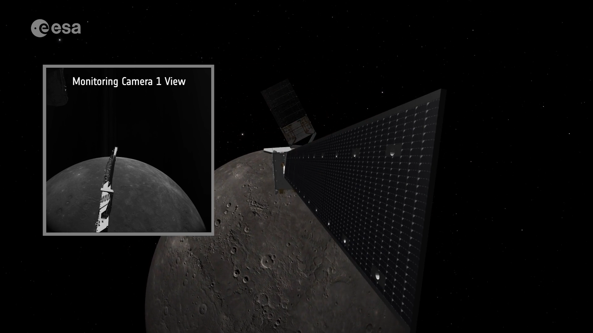 The loudest sounds in the audio include a rumbling noise, primarily caused by the rotation of BepiColombo’s large solar panels. The first rotation coincides with the spacecraft entering Mercury’s shadow at 00:17 in the video, while a second rotation around 00:51 is visually confirmed by onboard cameras.
